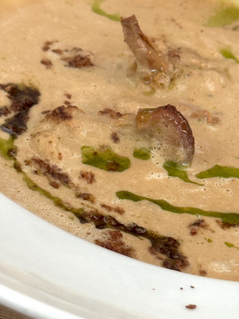 Als Vorspeise bekommt Klaus eine Pfifferlings Cremesuppe mit eingelegten Pfifferlingen, ich habe mich ganz simpel für das Sauerteigbrot mit Dip (Humus mit kleinen Applikationen) entschieden, beides mundet ganz vorzüglich und gibt eine gute Grundlage für den Wein…