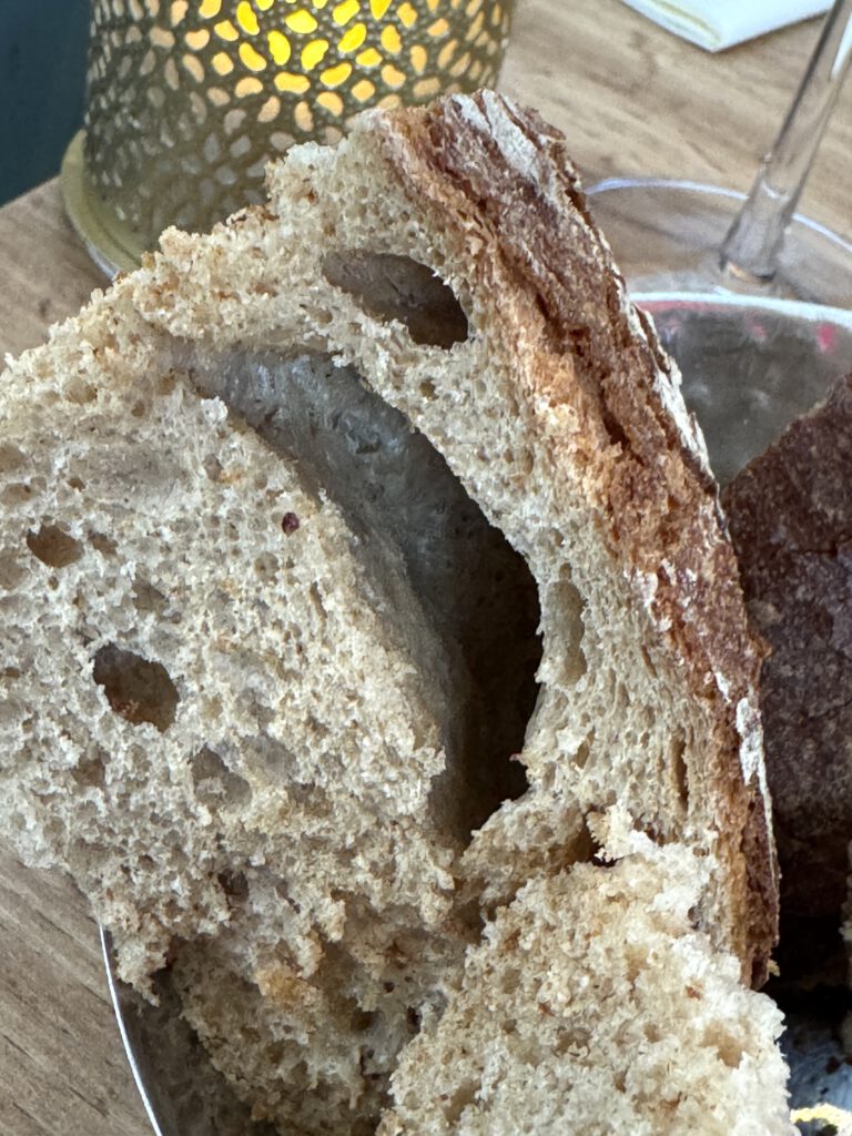 Das Brot ist ganz wunderbar, rösche Kruste und geschmacklich nicht so „over powered“ wie wir es neulich an anderer Stelle hatten, so kommen der Humus und seine „Applikationen“ sehr gut zur Geltung.