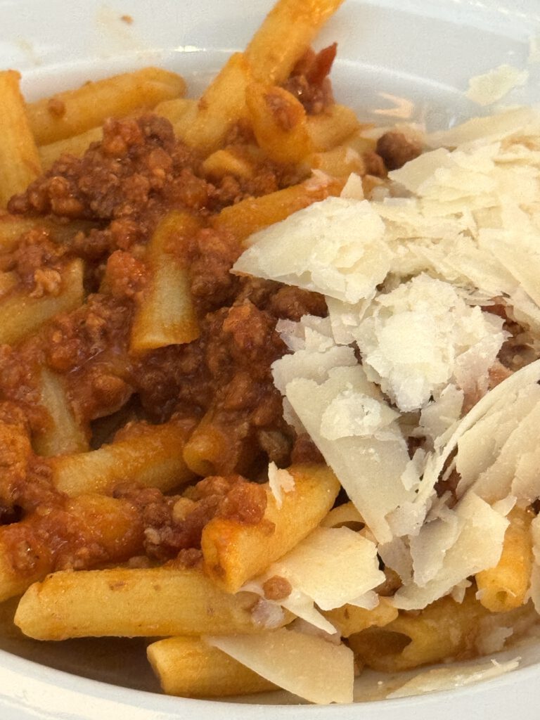 Dann lassen wir uns den Hauptgang munden. Klaus bekommt eine der Tagesempfehlungen, Penne mit Kalbs-Bolognese, ich habe mich für einen Klassiker entschieden 😉