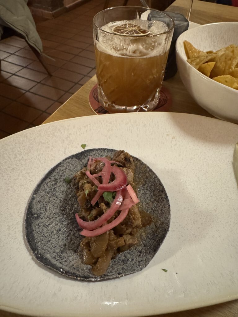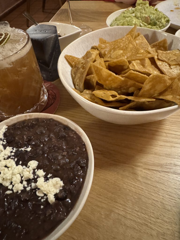 Da wir noch weiter Cocktails trinken (Tamarind Sour und Cactus Cooler), naschen wir auch noch ein bisschen mit Totopos mit Guacomole (lecker) und Frijoles (schwarze Bohnen, etwas schwach).