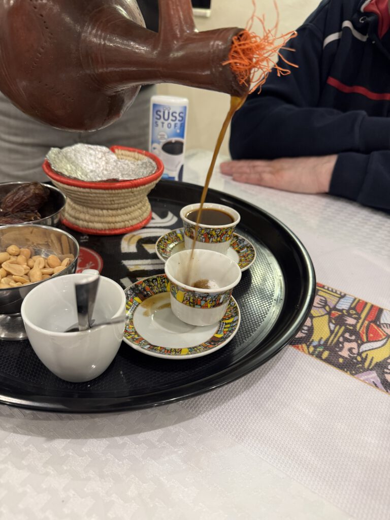 Zum Abschluss gönnen wir uns noch die eritreische Kaffeetafel. Dazu muss man allerdings sagen, dass wer lesen kann, klar im Vorteil ist! Ich hatte das nur auf der Rückseite der Speisekarte gesehen, allerdings steht dort kein Preis dran. Unter Desserts erfährt man dann nämlich die erschütternde Realität, bescheidene 30€ werden für den frisch gerösteten und gebrühten Kaffee fällig, puh, das ist schon ganz schön happig, wenngleich der Kaffee exzellent gemundet hat. So sieht das Ensemble aus:
