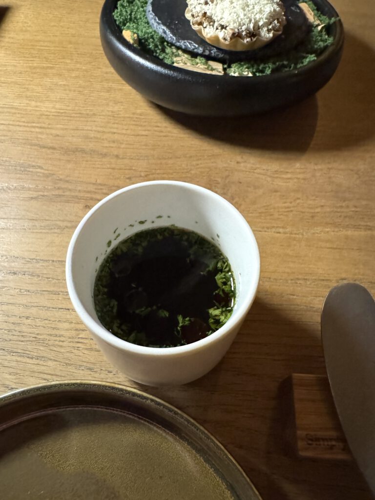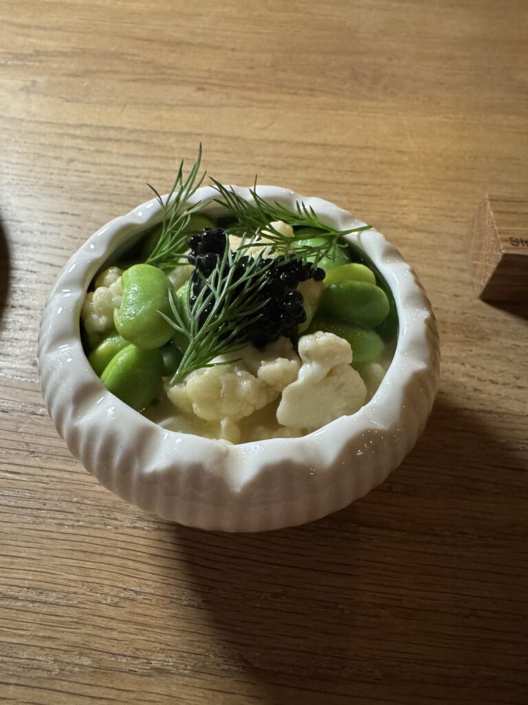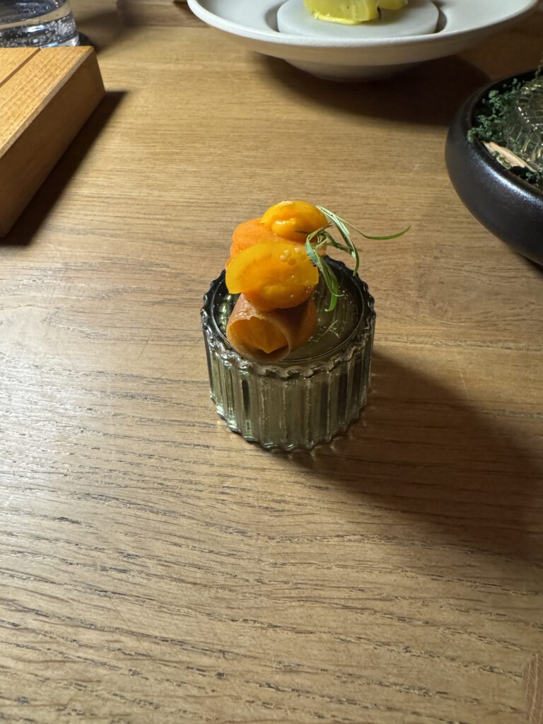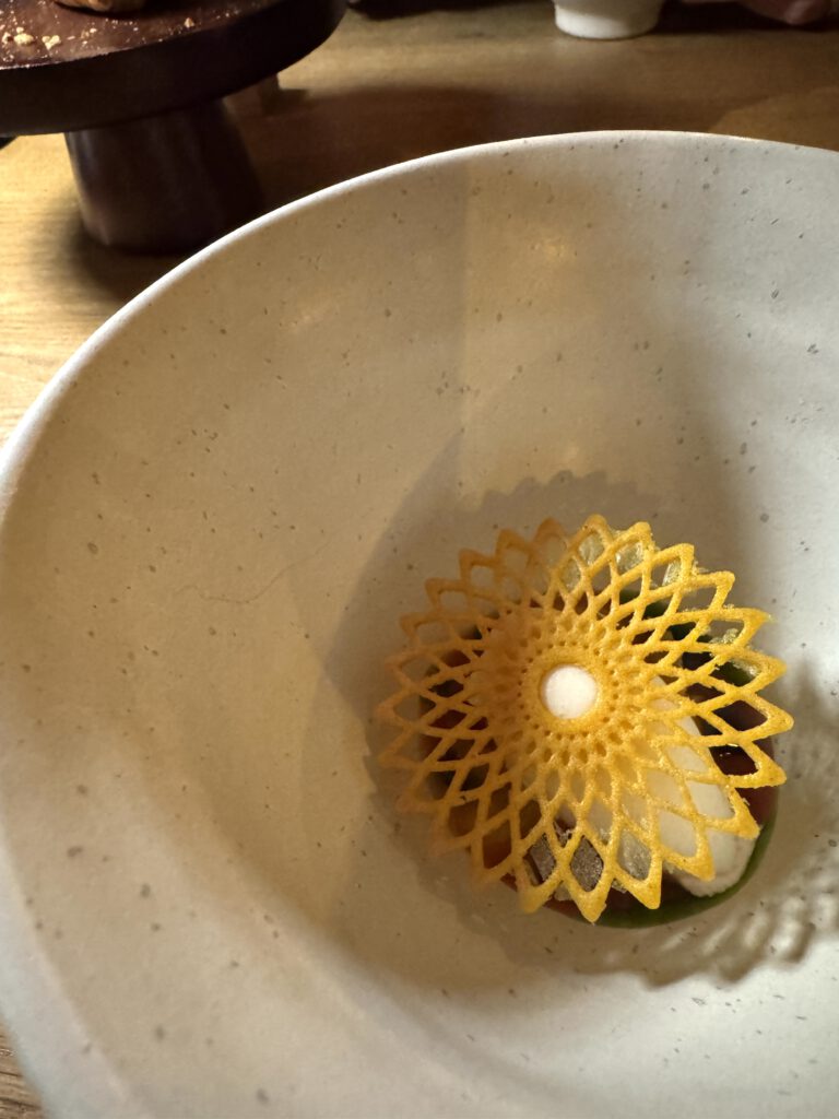Zunächst aber genießen wir diesen außergewöhnlich leckeren Schaumwein mit einer kaum enden wollenden Menge an Grüßen aus der Küche mit viel Geschmack und verschiedensten Texturen, wie eingangs erwähnt, eher Kunst als Schmaus.