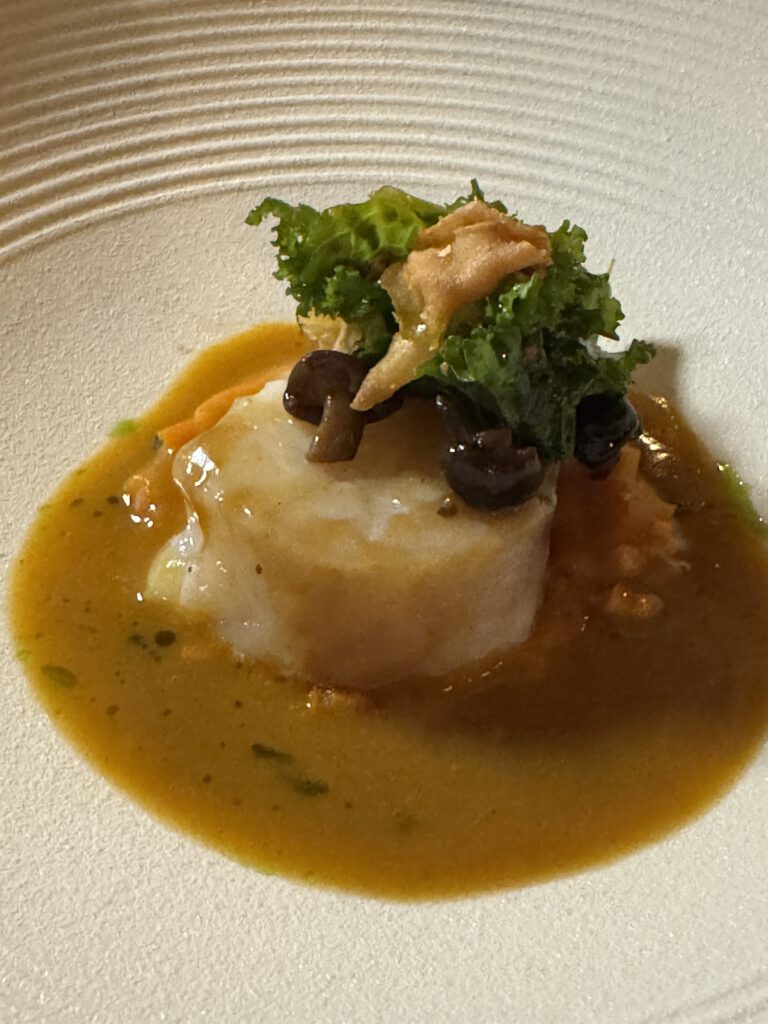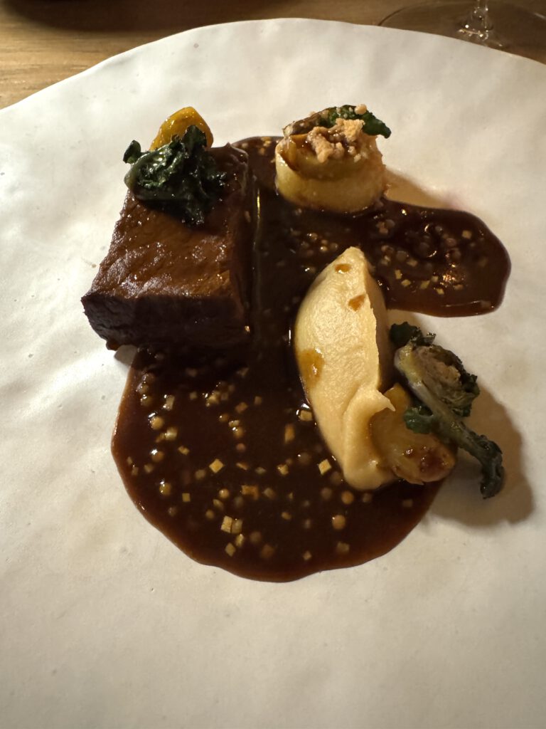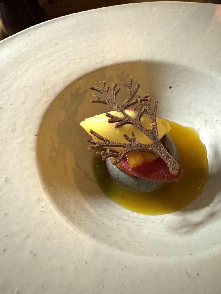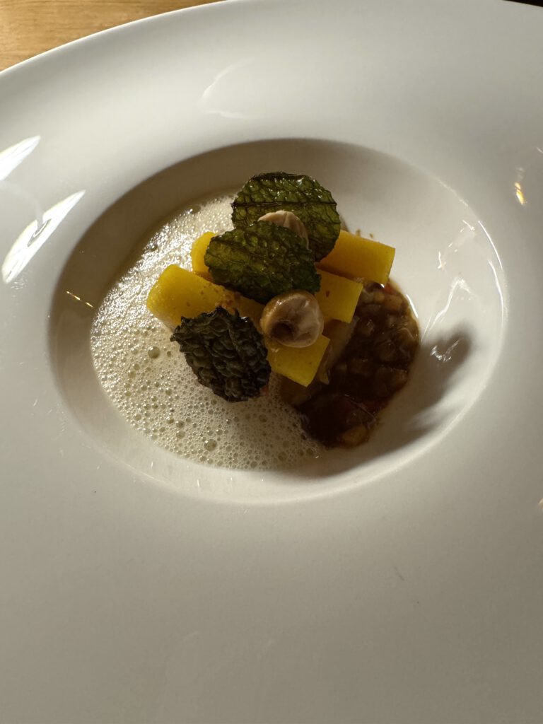 Da es ausdrücklich „Getränke“ und nicht Weinbegleitung gab, verzichteten wir auf diese (schade eigentlich) und entschieden uns für ein spannendes Cuvee aus Frankreich, welches das Menu gut unterstützt hat. Zu den abschließenden Gängen gab es dann noch Glasweise Unterstützung aus der Weinbegleitung.